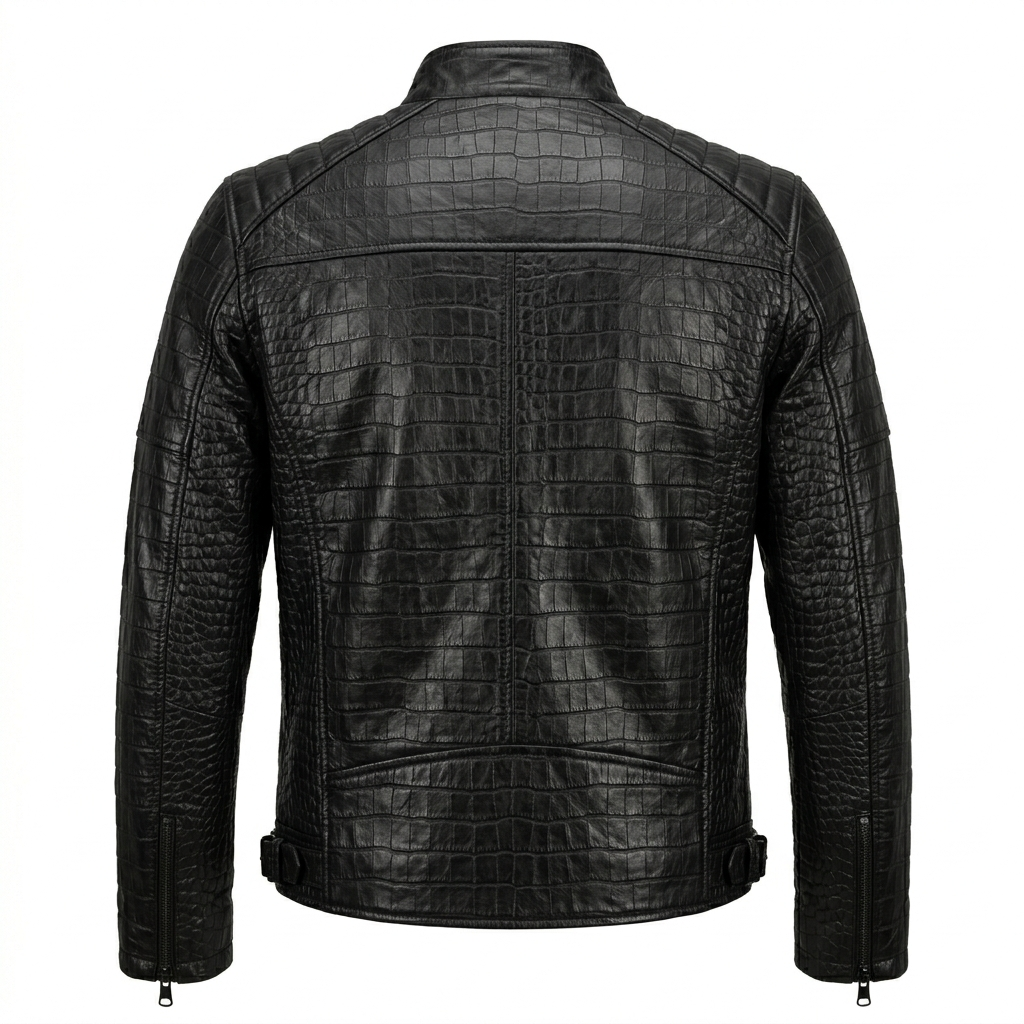 Upgrade your wardrobe with this Black Crocodile Embossed Leather Jacket, crafted from genuine leather for a bold and luxurious appearance. Designed for modern men, this biker jacket features a distinctive textured finish that reflects true exotic leather style. The tailored slim fit, reinforced stitching, and high-quality zippers ensure durability and long-term comfort. As part of the Blackstone premium collection, this jacket combines luxury streetwear with everyday functionality. Whether worn casually or for a statement look, this textured leather outerwear delivers refined style, making it an essential piece for those who value premium craftsmanship and standout fashion.